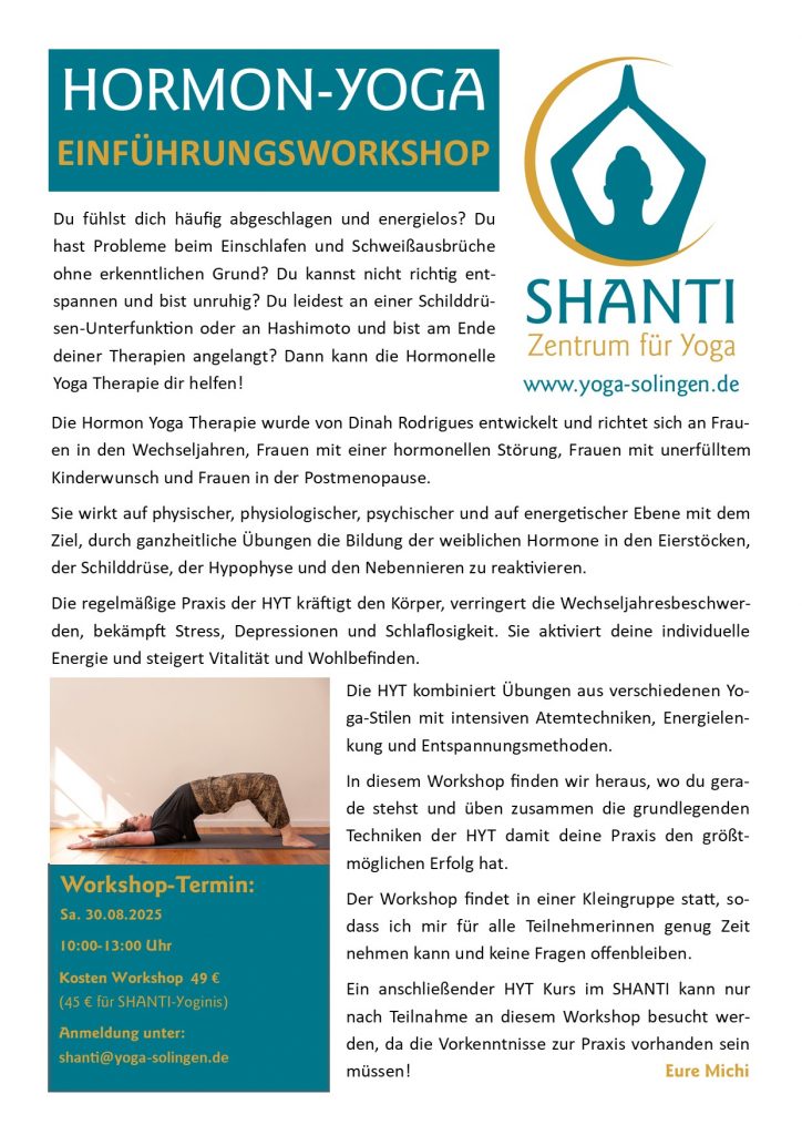 Du bist in den Wechseljahren oder hast eine andere hormonelle Störung? Dann schau dir die Infos zum Hormon Yoga, weiter unten im Flyer an und mach beim Einführungsworkshop mit!